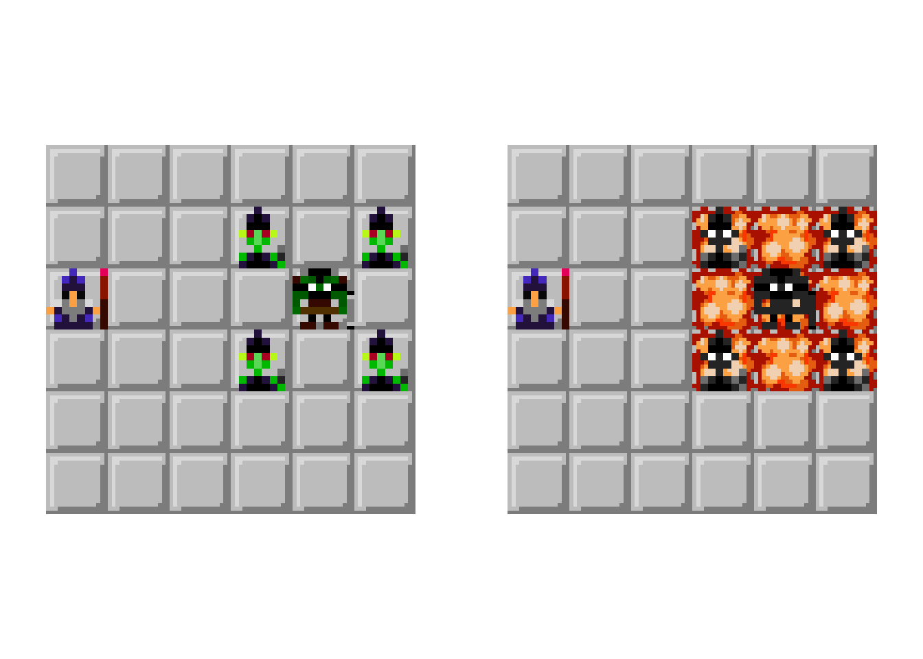 You see, this is a game set in a fantasy world where heroic adventurers such as fighters, rogues and wizards battle hordes of monsters like orcs and goblins. The figure to the left depicts a wizard (leftmost square) facing four goblins and an orc (to the right). Now, wizard characters are famous for their ability to conjure offensive spells to blast groups of enemies. The right figure shows one such spell, a Lesser Fireball, centered on the unfortunate orc, and producing an explosion that damages everything in adjacent squares - including the orc’s four goblin buddies. Observant readers will note that, due to the geometrical liberties we have taken in our choice of map representation, the aforementioned ball of fire is rendered as a perfect square. The author’s questionable sense of humor found this fact funny enough to use as the name for a blog and, years later, as the title of a game.